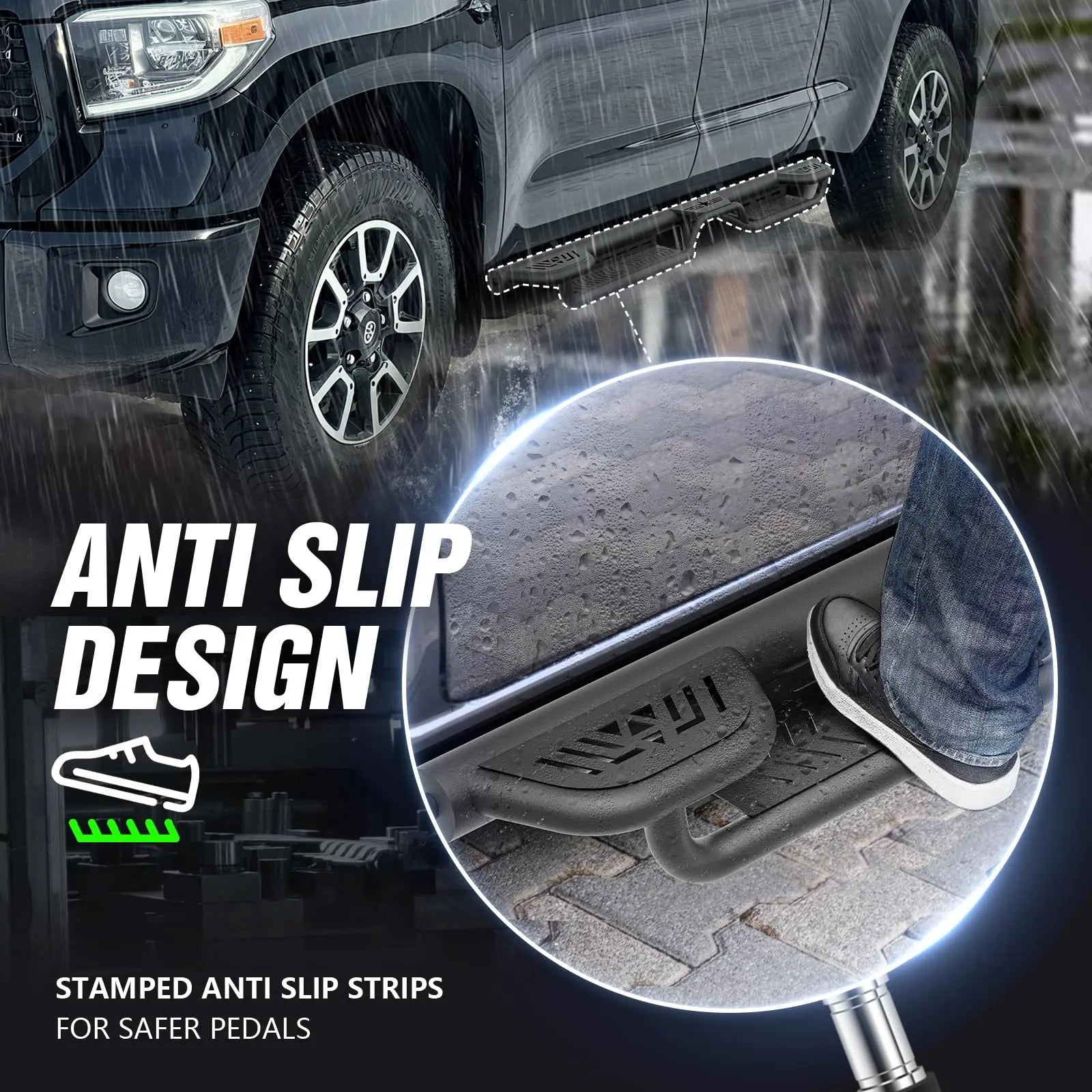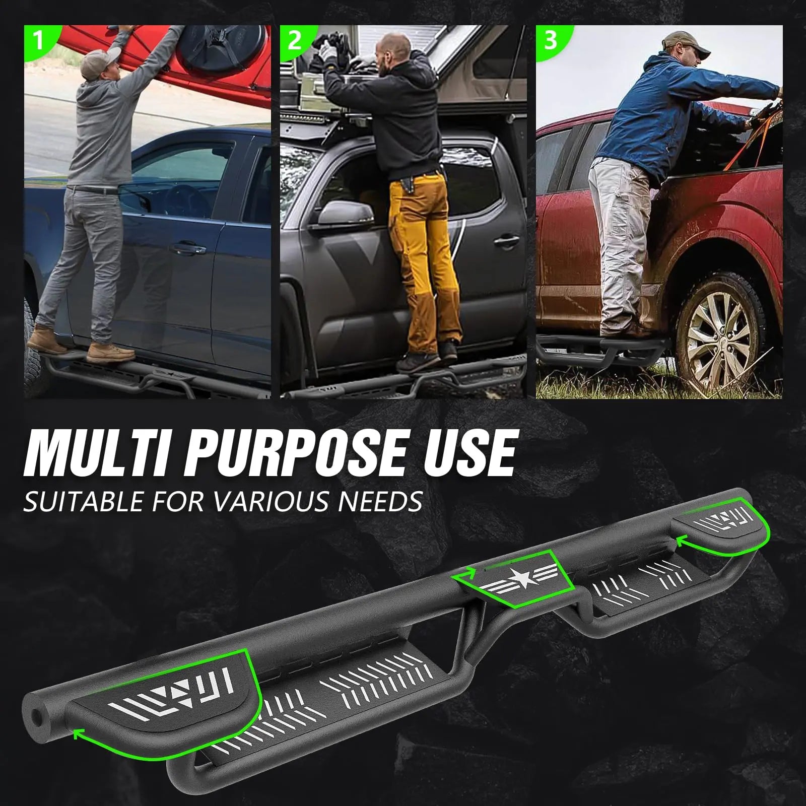 • 【Compatibility】: Three Raised Steps Running Boards are compatible with 2007 2008 2009 2010 2011 2012 2013 2014 2015 2016 2017 2018 2019 2020 2021 Toyota Tundra Double Cab (2 Full-Size Front Doors & 2 Narrower Rear Doors). If you are not sure about your model, please check the cab dimensions picture.