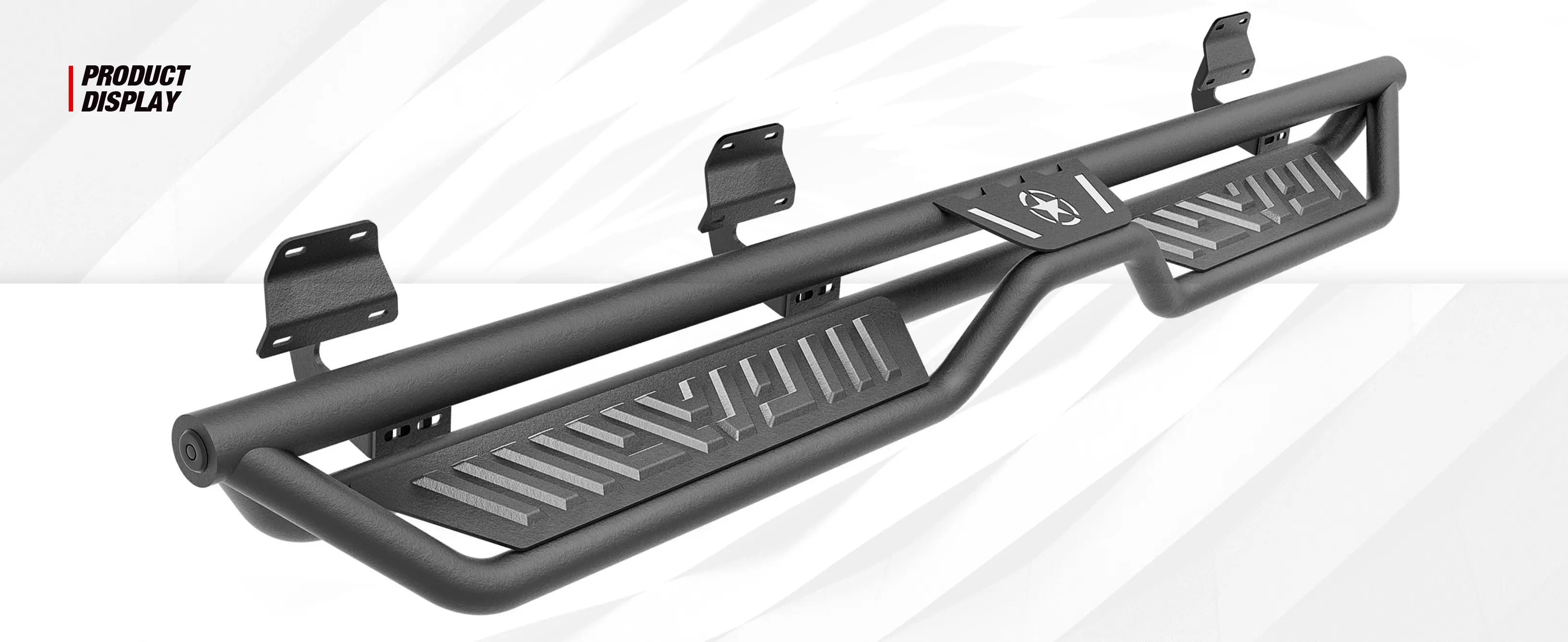 • 【Functional Design】: ① The side steps feature a dual-layer design, enhancing convenience for vehicles with lift kits and oversized tires, while also making roof access easier. ② The extra-thick main tube provides superior load-bearing capacity, preventing deformation and enhancing vehicle protection. ③ The stepping area is designed with a high-end textured pattern, ensuring secure and stable footing to prevent slipping.