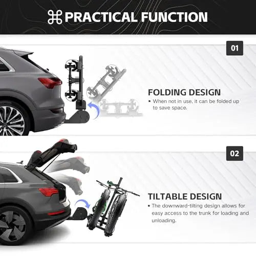 • 【Foldable and Tiltable Design】This YZONA E-Bike Rack features a fold-up design for convenient storage when not in use, and it can be easily tilted downward for access to the trunk, facilitating the loading and unloading of cargo.