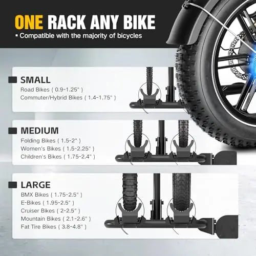 • 【Suitable for Various Bike Sizes and Frames】This YZONA electric bike hitch rack accommodates tires up to 5 inches wide and supports bikes with a wheelbase of up to 53 inches. It easily installs into a 2-inch hitch receiver and is designed to carry a variety of bicycles, including E-Bikes, Fat Tire Bikes, Mountain Bikes, Road Bikes, Cruiser Bikes, Commuter/Hybrid Bikes, BMX Bikes, Folding Bikes, Women's Bikes and Children's Bikes. (Note: Professional installation is highly recommended.)