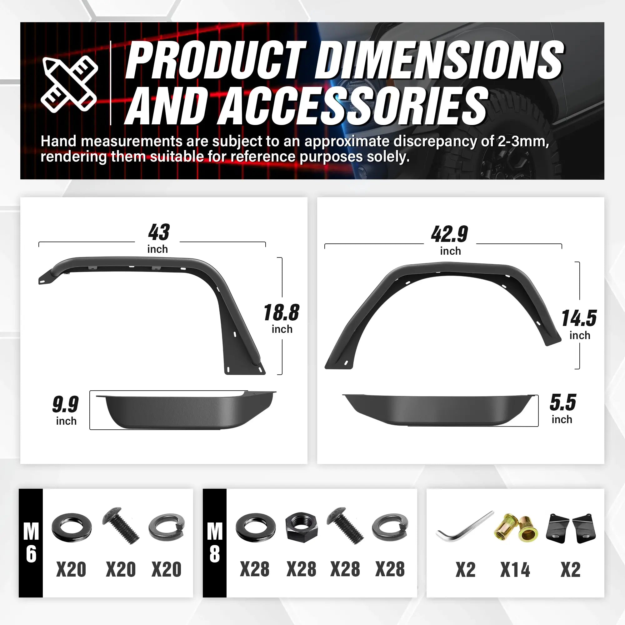 • 【Complete Accessories】This product includes all necessary accessories: 2 front fender flares, 2 rear fender flares, installation instructions, and screw fittings.