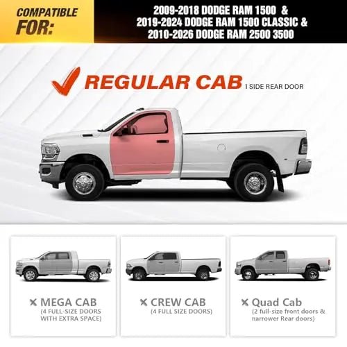 • 【Compatibility】: YZONA Two-Stairs Design Running Boards are compatible with Compatible with 2009-2018 Dodge Ram 1500, 2019-2024 1500 Classic, 2010-2026 Ram 2500 & 3500 Regular Cab. Please verify your vehicle’s model and year before purchasing to ensure a precise fit. If you are not sure about your model, please check the cab dimensions picture.