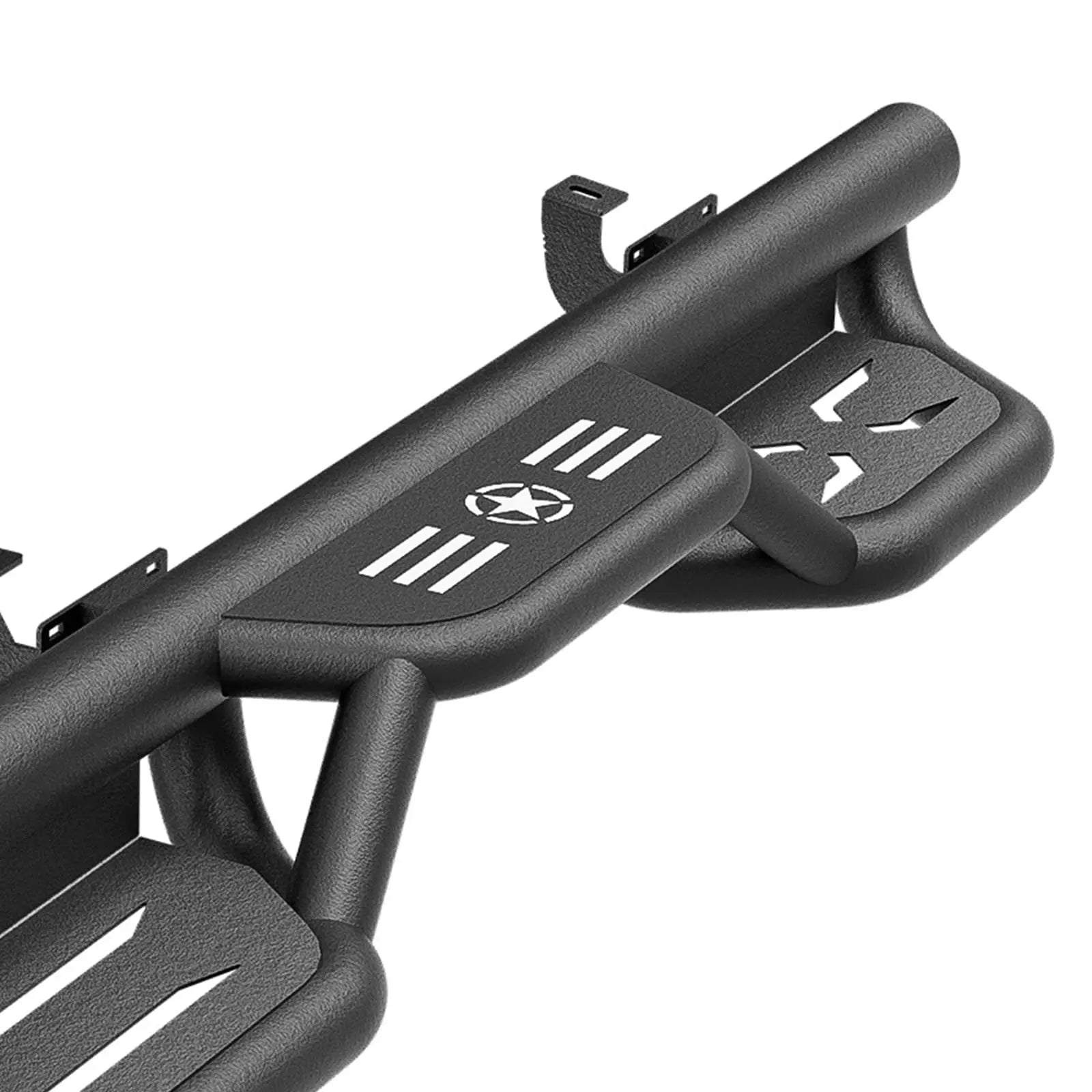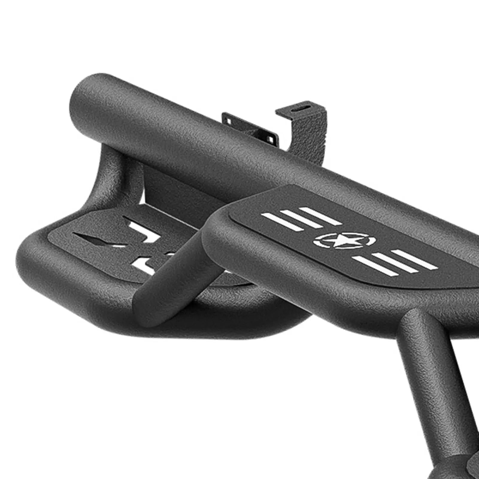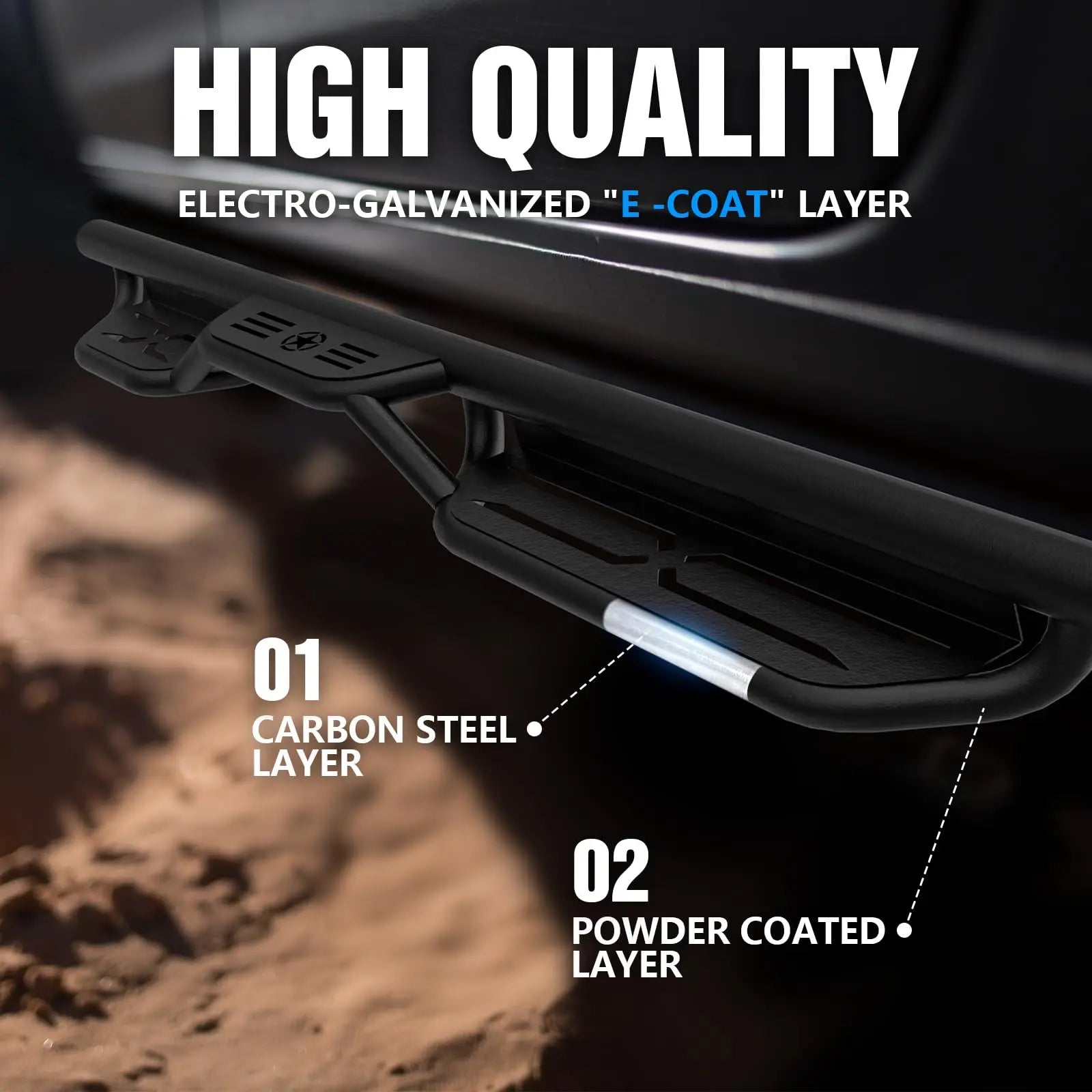 • 【Functional Design】: ① The side steps boast a two-tier layout, offering improved convenience for vehicles equipped with lift kits and oversized tires, as well as easier access to the roof. ② The ultra-thick main tube provides exceptional weight-bearing capacity, ensuring the step resists deformation and enhances vehicle protection. ③ The hollow design of the step area ensures safe and stable footing, prevents water accumulation, and reduces driving resistance.