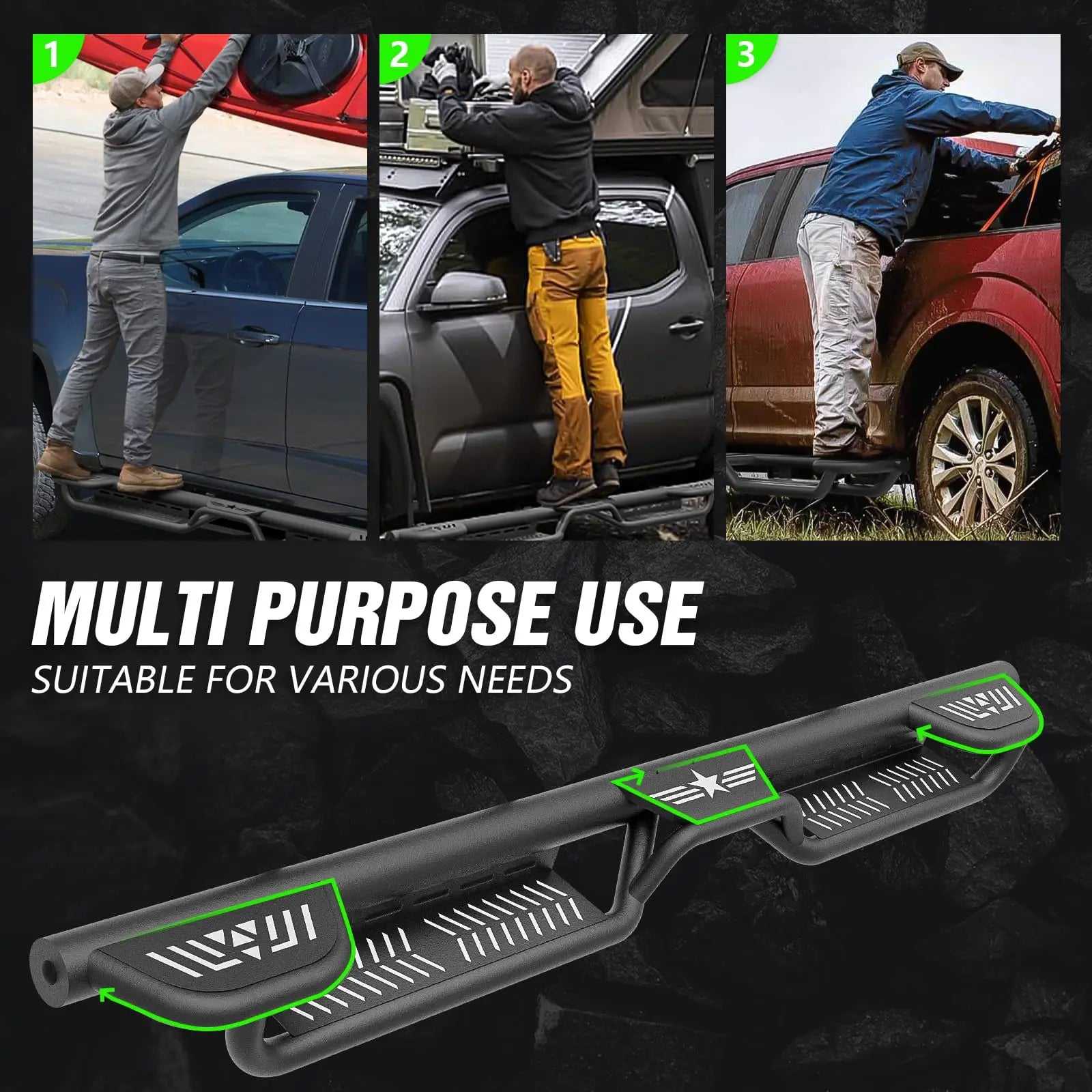 • 【Compatibility】: Three Raised Steps Running Boards are compatible with 2024 2025 Toyota Tacoma Double Cab / Crew Cab (4 Full-Size Doors). If you are not sure about your model, please check the cab dimensions picture.