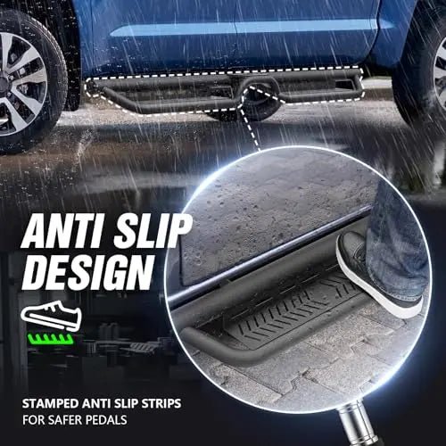 • 【Functional Design】:① The side steps feature a dual - layer layout, offering greater convenience for vehicles equipped with lift kits and oversized tires. It also facilitates easy access to the vehicle's roof.② The 6 - inch drop - down step pads provide excellent accessibility for pickup trucks with lift kits and oversized tires, while maintaining sufficient ground clearance.